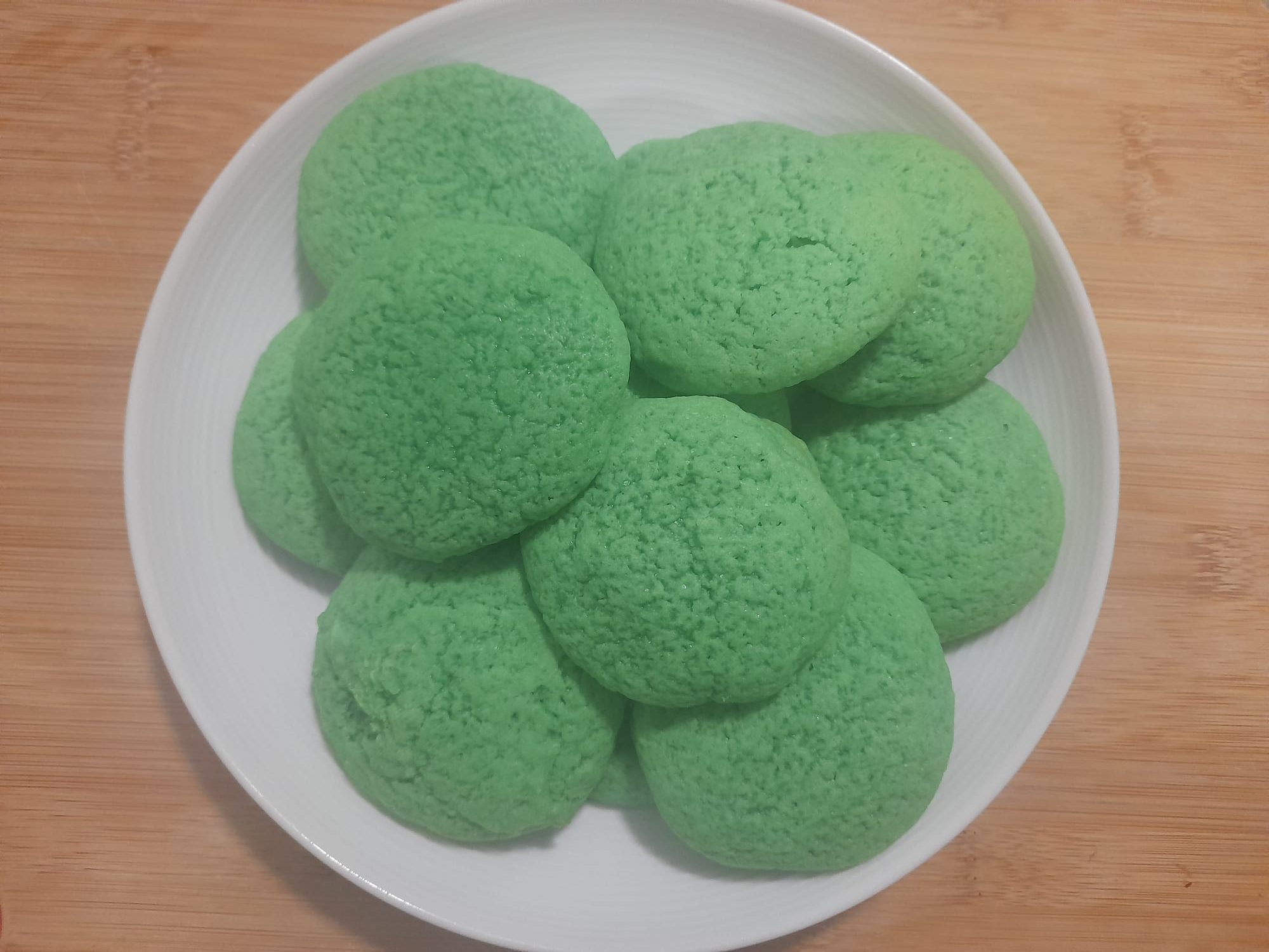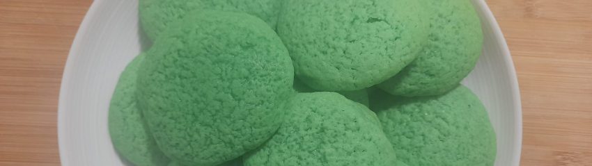 We love pandan in our household, particularly pandan cake. But sometimes there isn’t enough time to make them and you just need a quick recipe. This is that. Soft cookies that are great with a cup of coffee. Given their colour (from the essence) they’re Paddy’s day!